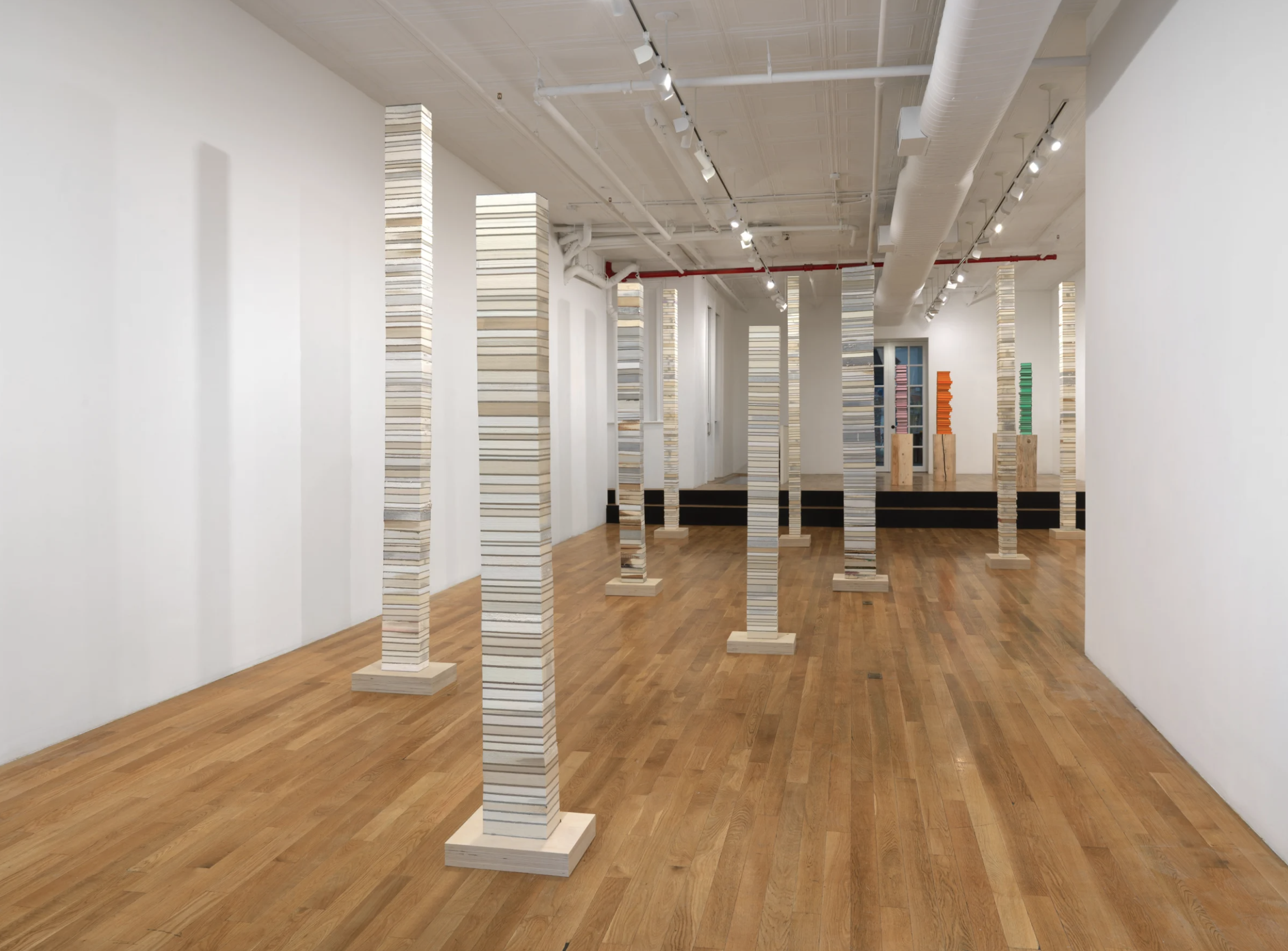 CHART is pleased to present our upcoming exhibition, JARED BARK: STACKS. Best known for his experimental photobooth assemblages from the 60’s and 70’s, Bark will debut this new body of sculptural work culled from stacked books, drawing inspiration from nature, personal history, and the aesthetics of chance. Returning to a full-time studio practice in 2012, he began utilizing books as an object to be reappropriated. Using various actions to manipulate the books, Bark expands the physical properties of the material, all while operating under a self-imposed set of limitations. Ranging in height from five to ten feet, some are presented straightforwardly while others are more abstracted. His most recent iteration of these stacks, called “Cants”, are a metaphoric reference to a squared timber sawn from a whole log on a sawmill. In these works, the stacks are milled on all four sides, removing any evidence of the original object. Bark is beholden to chance, allowing the irregularities in the books and saw blade to dictate the final outcome. The resulting surfaces evoke geological formations, recall Classical architecture, and hint at painterly abstraction. This is Bark’s longest series to date.